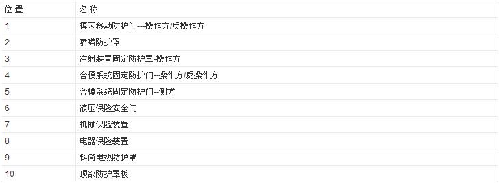 固定防護(hù)門(mén)安裝在合模區(qū)域操作方和反操作方,射膠裝置前面和側(cè)面。其它固定防護(hù)門(mén),防止從二板側(cè)進(jìn)合模裝置:防止可能碰到料筒隔熱裝置。