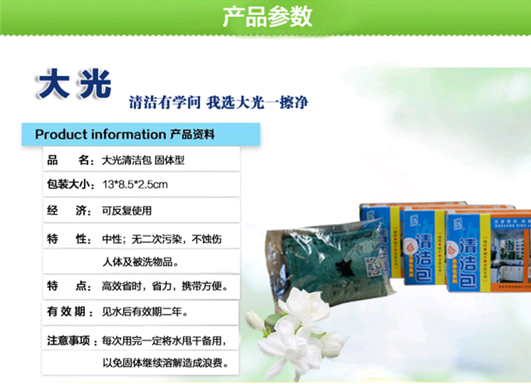 注意事項(xiàng):清潔包表面臟物,手搓見水即凈,每次用完一定將水甩干備用,以免固體繼續(xù)溶解造成浪費(fèi);本品對水銹,焦油油漆無效。